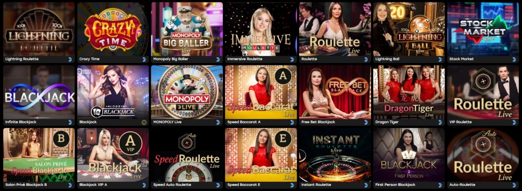 - Game Shows: Enjoy exciting, interactive game shows like Crazy Time, Monopoly Live, and Dream Catcher for a unique and dynamic gaming experience.